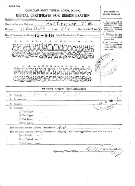 To fill the time caused by the delays in England soldiers were forced to complete elaborate documentation and medical examinations. Carroll Patterson's demobilization physical in England on 15 May 1919 revealed that conditions for him had not been all that bad, as he had grown to 5 foot 10 inches and had put on 20 pounds since he had enlisted ten months earlier. It was noted that he had a good physique, good nutrition, good arteries, good hearing, and a pulse of 70 and 6/6 vision in both eyes. His dental records however revealed that he had developed five new cavities and was in need of more dental work. The dental service soon had him in tip-top shape though.