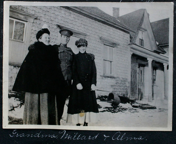 The three images of Millard wtih people in them were taken at Campburn Farm in Harvey with his Grandma Robison (nee Eleanor "Jane" Herbert). Millard's nephew Al Robison vividly remembers "Uncle Albert -- our Grandpa Robison's younger brother -- telling me when I met him in Harvey on my first visit there about the joyful celebration they all had down at the train station when Norman and Millard came though on their way to Halifax to board the ship for England. Their idea was to go over there and give the Huns "a good kick in the ass" and then be back in time for Christmas. That was apparently a common view throughout Canada in 1915, that the troops would be home by Christmas." Source: Tim Patterson, 7 Aug 2008 from the Robison Family photograph collections at Campburn Farm, Harvey Station, York County, New Brunswick.