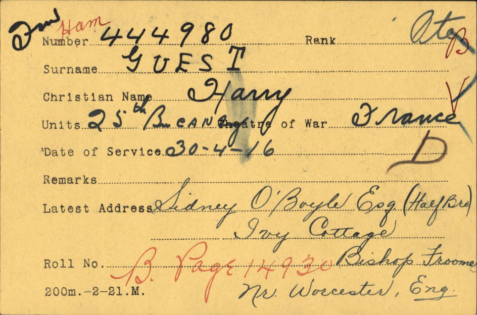 From the 1901 Census, Harry Guest was a lodger in the home of Andrew Robison and his wife Frances in Harvey Station, born 31 May 1895, England, and came to Canada in 1899. This census data is at odds with his army records and the information in McQuinn (2006; see above).