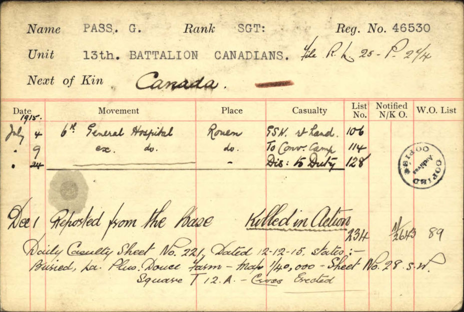When a recruit signed up for the Canadian Expeditionary Force in WW I he filled in an attestation paper that indicated his willingness to serve in the military and provided such information as date of birth, next of kin, height, weight, complexion, occupation, etc. As such these papers are of genealogical importance. The links below are to a scanned copy of the attestation papers of George Pass completed on 28 September, 1914, in Valcartier, Quebec when he was inducted into the Nova Scotia Battalion of the Canadian Expeditionary Force until his death in action on 1 December, 1915 in Belgium. During his service he received a gunshot wound to his right hand on 4 July 1915 and was hospitalized in Rouen, France. He returned to service on 24 July 1915 and had returned to the field with the 13th Battalion 7 August, 1915.