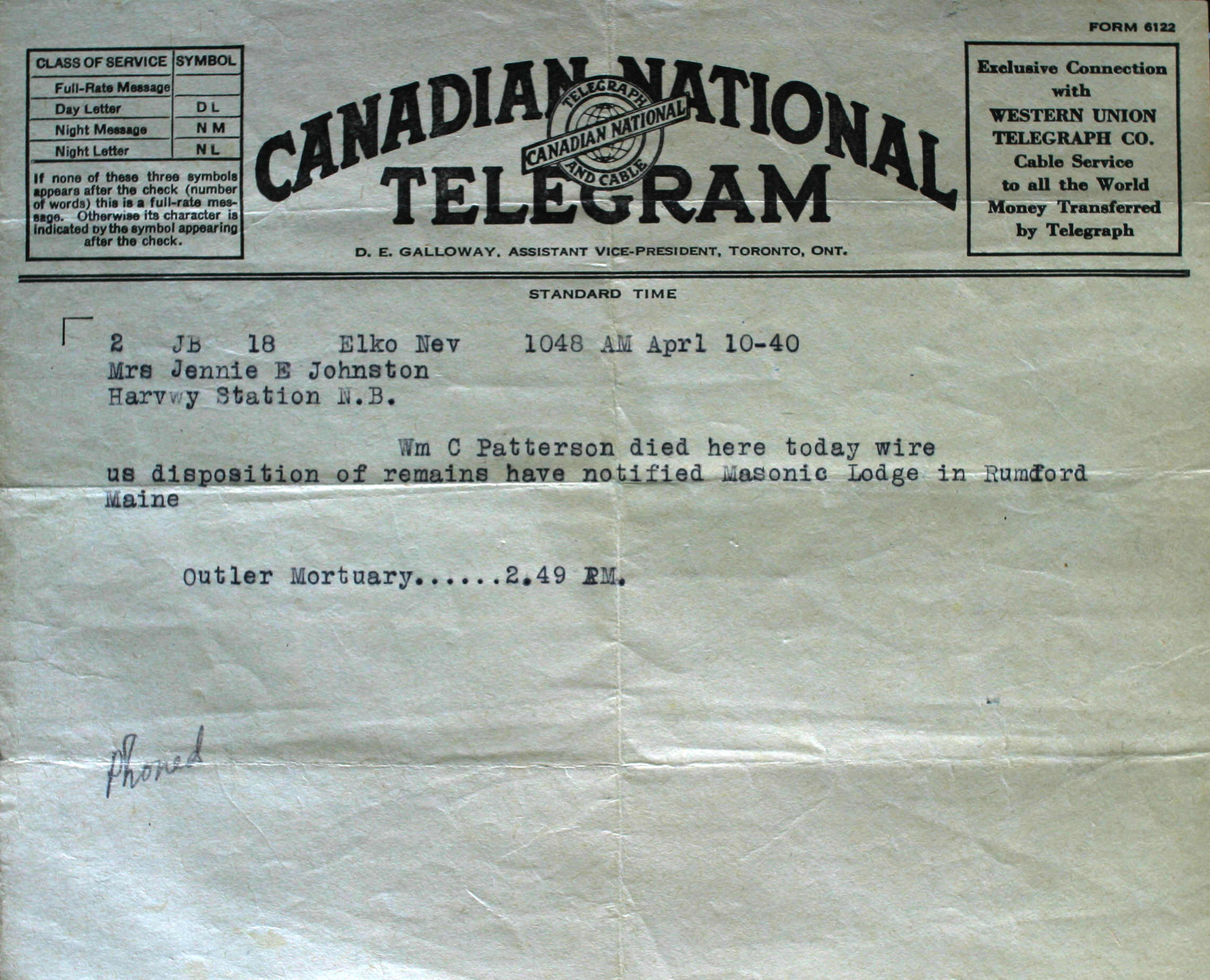 Source: Original photograph in collection of Luanna (Patterson) Culberson, Woodstock, New Brunswick. Posted image taken by Tim Patterson July 27, 2006. Only modification from original image is a slight increase in saturation and repair of three minor rips in the margins.