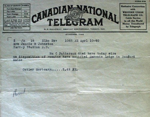 Harvey Station -- The death of Carrol M. Patterson occurred at Harvey Hospital. He was 88. Born in Tweedside, York County, he was the son of James and Annie (Brown) Patterson. He was a veteran of World War One, having served overseas with the Canadian Army. He was a member of Knox Presbyterian Church.